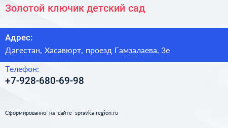 Золотой ключик, детский сад по адресу Дагестан, Хасавюрт, проезд Гамзалаева, 3е в дальнейшем Организация, размещена в следующих категориях: