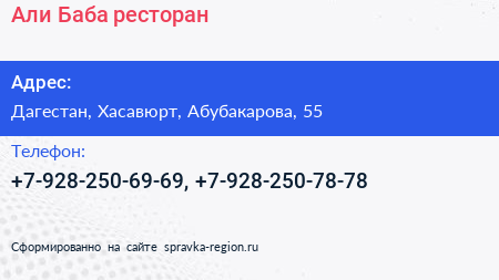 Али Баба, ресторан по адресу Дагестан, Хасавюрт, Абубакарова, 55 в дальнейшем Организация, размещена в следующих категориях:
