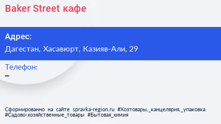 Baker Street, кафе по адресу Дагестан, Хасавюрт, Казияв-Али, 29 в дальнейшем Организация, размещена в следующих категориях: