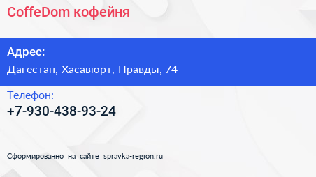 CoffeDom, кофейня по адресу Дагестан, Хасавюрт, Правды, 74 в дальнейшем Организация, размещена в следующих категориях: