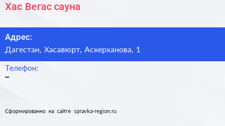 Хас Вегас, сауна по адресу Дагестан, Хасавюрт, Аскерханова, 1 в дальнейшем Организация, размещена в следующих категориях: