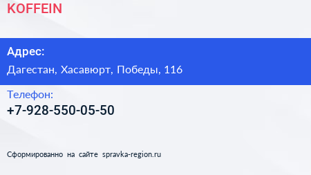 KOFFEIN по адресу Дагестан, Хасавюрт, Победы, 116 в дальнейшем Организация, размещена в следующих категориях: