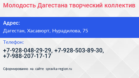 Молодость Дагестана, творческий коллектив по адресу Дагестан, Хасавюрт, Нурадилова, 75 в дальнейшем Организация, размещена в следующих категориях: