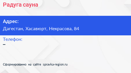 Радуга, сауна по адресу Дагестан, Хасавюрт, Некрасова, 84 в дальнейшем Организация, размещена в следующих категориях: