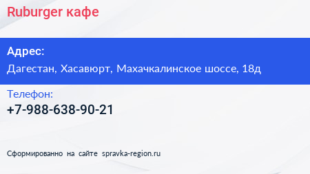 Ruburger, кафе по адресу Дагестан, Хасавюрт, Махачкалинское шоссе, 18д в дальнейшем Организация, размещена в следующих категориях: