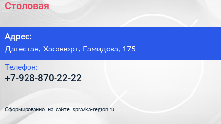 Столовая по адресу Дагестан, Хасавюрт, Гамидова, 175 в дальнейшем Организация, размещена в следующих категориях: