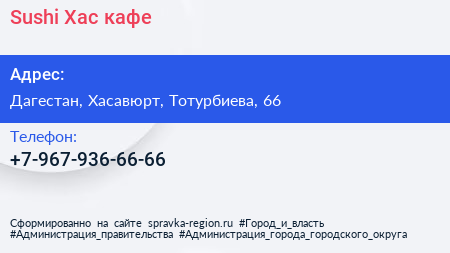 Sushi Хас, кафе по адресу Дагестан, Хасавюрт, Тотурбиева, 66 в дальнейшем Организация, размещена в следующих категориях: