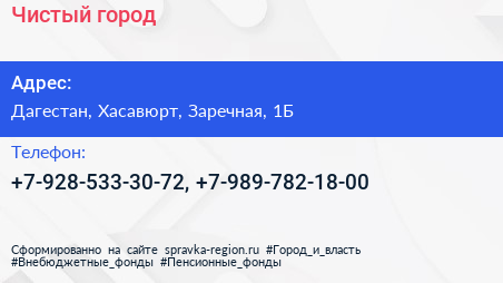 Чистый город по адресу Дагестан, Хасавюрт, Заречная, 1Б в дальнейшем Организация, размещена в следующих категориях: