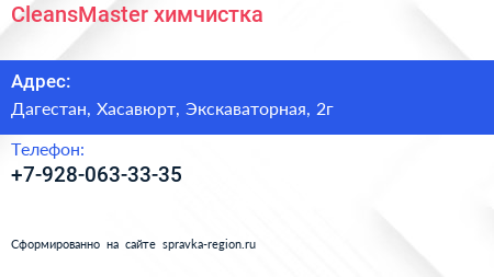 CleansMaster, химчистка по адресу Дагестан, Хасавюрт, Экскаваторная, 2г в дальнейшем Организация, размещена в следующих категориях: