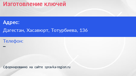Изготовление ключей по адресу Дагестан, Хасавюрт, Тотурбиева, 136 в дальнейшем Организация, размещена в следующих категориях: