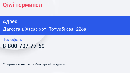 Qiwi, терминал по адресу Дагестан, Хасавюрт, Тотурбиева, 226а в дальнейшем Организация, размещена в следующих категориях: