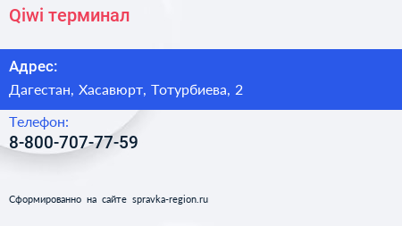 Qiwi, терминал по адресу Дагестан, Хасавюрт, Тотурбиева, 2 в дальнейшем Организация, размещена в следующих категориях: