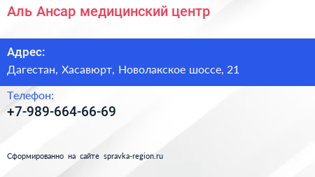 Аль-Ансар, медицинский центр по адресу Дагестан, Хасавюрт, Новолакское шоссе, 21 в дальнейшем Организация, размещена в следующих категориях: