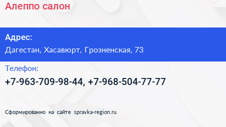 Алеппо, салон по адресу Дагестан, Хасавюрт, Грозненская, 73 в дальнейшем Организация, размещена в следующих категориях: