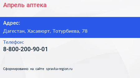 Апрель, аптека по адресу Дагестан, Хасавюрт, Тотурбиева, 78 в дальнейшем Организация, размещена в следующих категориях: