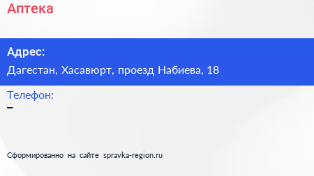Аптека по адресу Дагестан, Хасавюрт, проезд Набиева, 18 в дальнейшем Организация, размещена в следующих категориях: