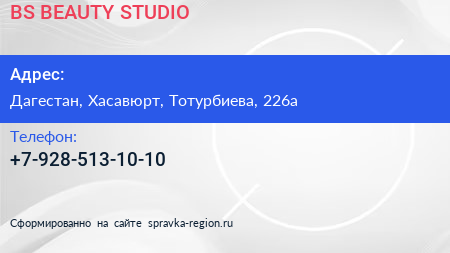 BS BEAUTY STUDIO по адресу Дагестан, Хасавюрт, Тотурбиева, 226а в дальнейшем Организация, размещена в следующих категориях: