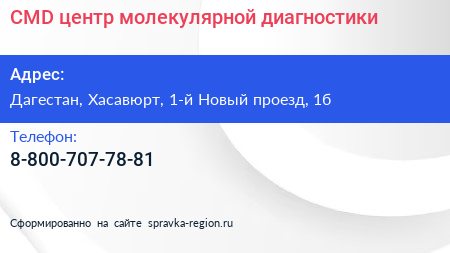 CMD, центр молекулярной диагностики по адресу Дагестан, Хасавюрт, 1-й Новый проезд, 1б в дальнейшем Организация, размещена в следующих категориях: