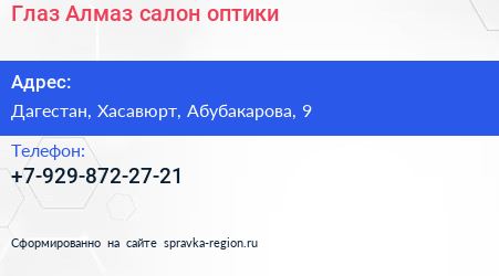 Глаз Алмаз, салон оптики по адресу Дагестан, Хасавюрт, Абубакарова, 9 в дальнейшем Организация, размещена в следующих категориях: