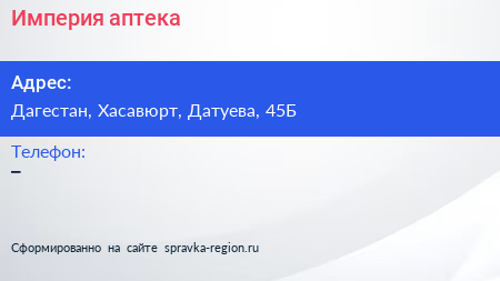 Империя, аптека по адресу Дагестан, Хасавюрт, Датуева, 45Б в дальнейшем Организация, размещена в следующих категориях:
