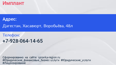 Имплант+ по адресу Дагестан, Хасавюрт, Воробьёва, 48л в дальнейшем Организация, размещена в следующих категориях: