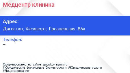 Медцентр, клиника по адресу Дагестан, Хасавюрт, Грозненская, 86а в дальнейшем Организация, размещена в следующих категориях: