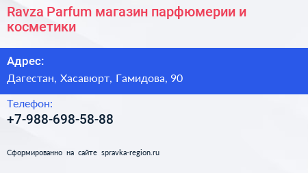Ravza Parfum, магазин парфюмерии и косметики по адресу Дагестан, Хасавюрт, Гамидова, 90 в дальнейшем Организация, размещена в следующих категориях: