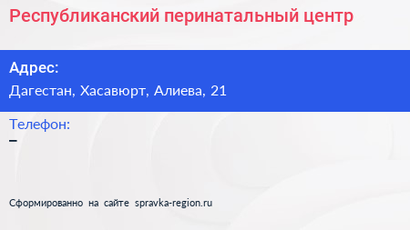 Республиканский перинатальный центр по адресу Дагестан, Хасавюрт, Алиева, 21 в дальнейшем Организация, размещена в следующих категориях: