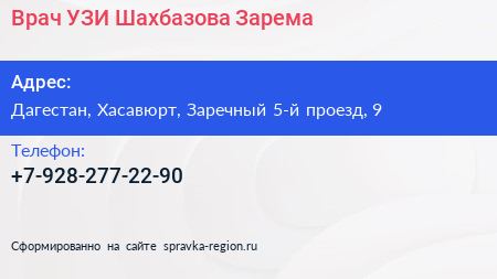 Врач УЗИ Шахбазова Зарема по адресу Дагестан, Хасавюрт, Заречный 5-й проезд, 9 в дальнейшем Организация, размещена в следующих категориях:
