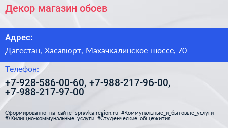 Декор, магазин обоев по адресу Дагестан, Хасавюрт, Махачкалинское шоссе, 70 в дальнейшем Организация, размещена в следующих категориях: