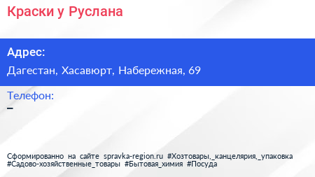 Краски у Руслана по адресу Дагестан, Хасавюрт, Набережная, 69 в дальнейшем Организация, размещена в следующих категориях: