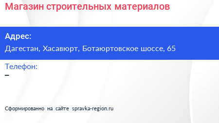 Магазин строительных материалов по адресу Дагестан, Хасавюрт, Ботаюртовское шоссе, 65 в дальнейшем Организация, размещена в следующих категориях: