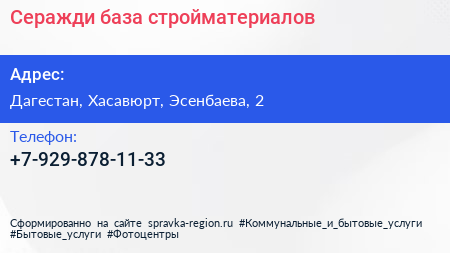 Серажди, база стройматериалов по адресу Дагестан, Хасавюрт, Эсенбаева, 2 в дальнейшем Организация, размещена в следующих категориях: