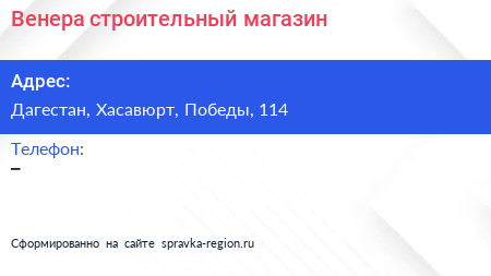 Венера, строительный магазин по адресу Дагестан, Хасавюрт, Победы, 114 в дальнейшем Организация, размещена в следующих категориях:
