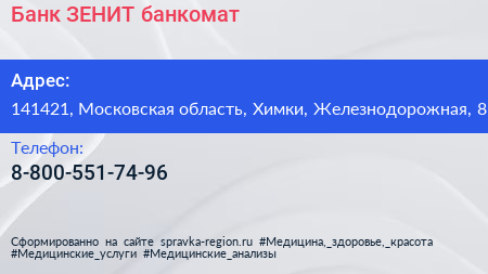 Банк ЗЕНИТ, банкомат по адресу 141421, Московская область, Химки, Железнодорожная, 8 в дальнейшем Организация, размещена в следующих категориях: