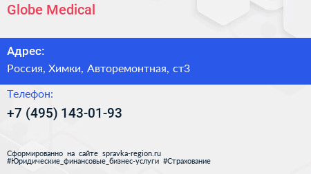 Globe Medical по адресу Складской комплекс "Грюнштадт", 3, Фирсановское шоссе, Восточная зона, Елино, Зеленоград, городской округ Солнечногорск, Московская область, Центральный федеральный округ, 115280, Россия в дальнейшем Организация, размещена в следующих категориях: