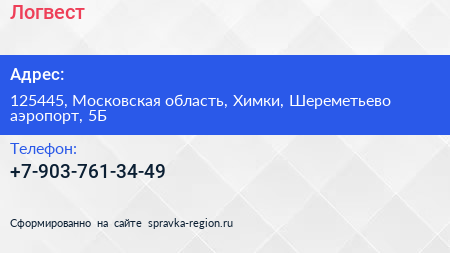 Логвест по адресу 125445, Московская область, Химки, Шереметьево аэропорт, 5Б в дальнейшем Организация, размещена в следующих категориях: