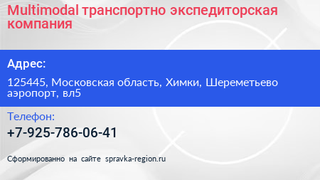 Multimodal, транспортно-экспедиторская компания по адресу 125445, Московская область, Химки, Шереметьево аэропорт, вл5 в дальнейшем Организация, размещена в следующих категориях: