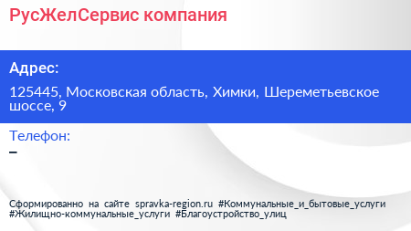 РусЖелСервис, компания по адресу 125445, Московская область, Химки, Шереметьевское шоссе, 9 в дальнейшем Организация, размещена в следующих категориях: