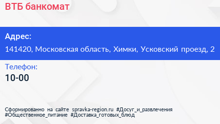 ВТБ, банкомат по адресу 141420, Московская область, Химки, Усковский проезд, 2 в дальнейшем Организация, размещена в следующих категориях: