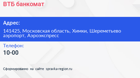 ВТБ, банкомат по адресу 141425, Московская область, Химки, Шереметьево аэропорт, Аэроэкспресс в дальнейшем Организация, размещена в следующих категориях: