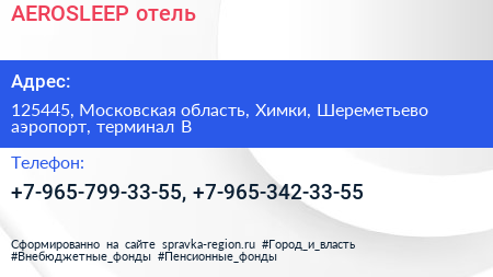 AEROSLEEP, отель по адресу 125445, Московская область, Химки, Шереметьево аэропорт, терминал B в дальнейшем Организация, размещена в следующих категориях: