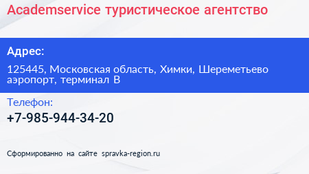 Academservice, туристическое агентство по адресу 125445, Московская область, Химки, Шереметьево аэропорт, терминал B в дальнейшем Организация, размещена в следующих категориях: