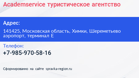 Academservice, туристическое агентство по адресу 141425, Московская область, Химки, Шереметьево аэропорт, терминал E в дальнейшем Организация, размещена в следующих категориях: