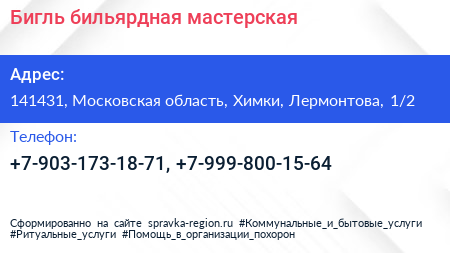 Бигль, бильярдная мастерская по адресу 141431, Московская область, Химки, Лермонтова, 1/2 в дальнейшем Организация, размещена в следующих категориях: