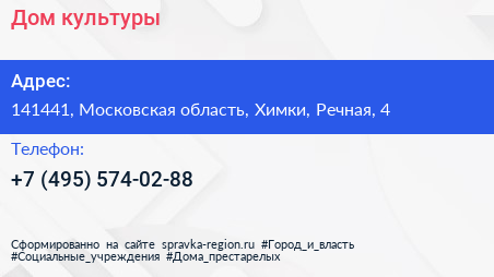 Дом культуры по адресу 141441, Московская область, Химки, Речная, 4 в дальнейшем Организация, размещена в следующих категориях: