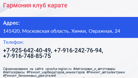 Гармония, клуб карате по адресу 141420, Московская область, Химки, Овражная, 24 в дальнейшем Организация, размещена в следующих категориях: