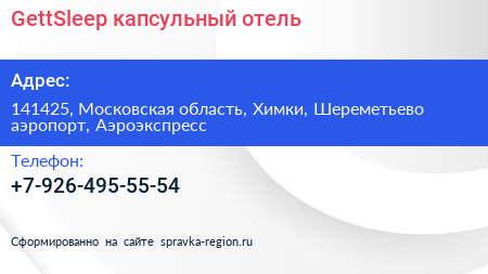 GettSleep, капсульный отель по адресу 141425, Московская область, Химки, Шереметьево аэропорт, Аэроэкспресс в дальнейшем Организация, размещена в следующих категориях: