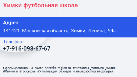 Химки, футбольная школа по адресу 141421, Московская область, Химки, Ленина, 54а в дальнейшем Организация, размещена в следующих категориях: