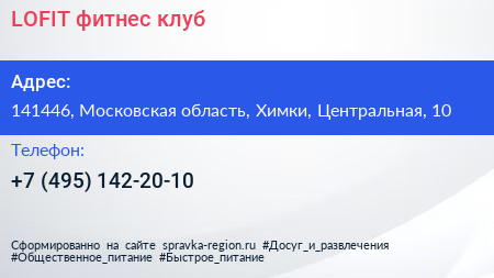 LOFIT, фитнес-клуб по адресу 141446, Московская область, Химки, Центральная, 10 в дальнейшем Организация, размещена в следующих категориях: